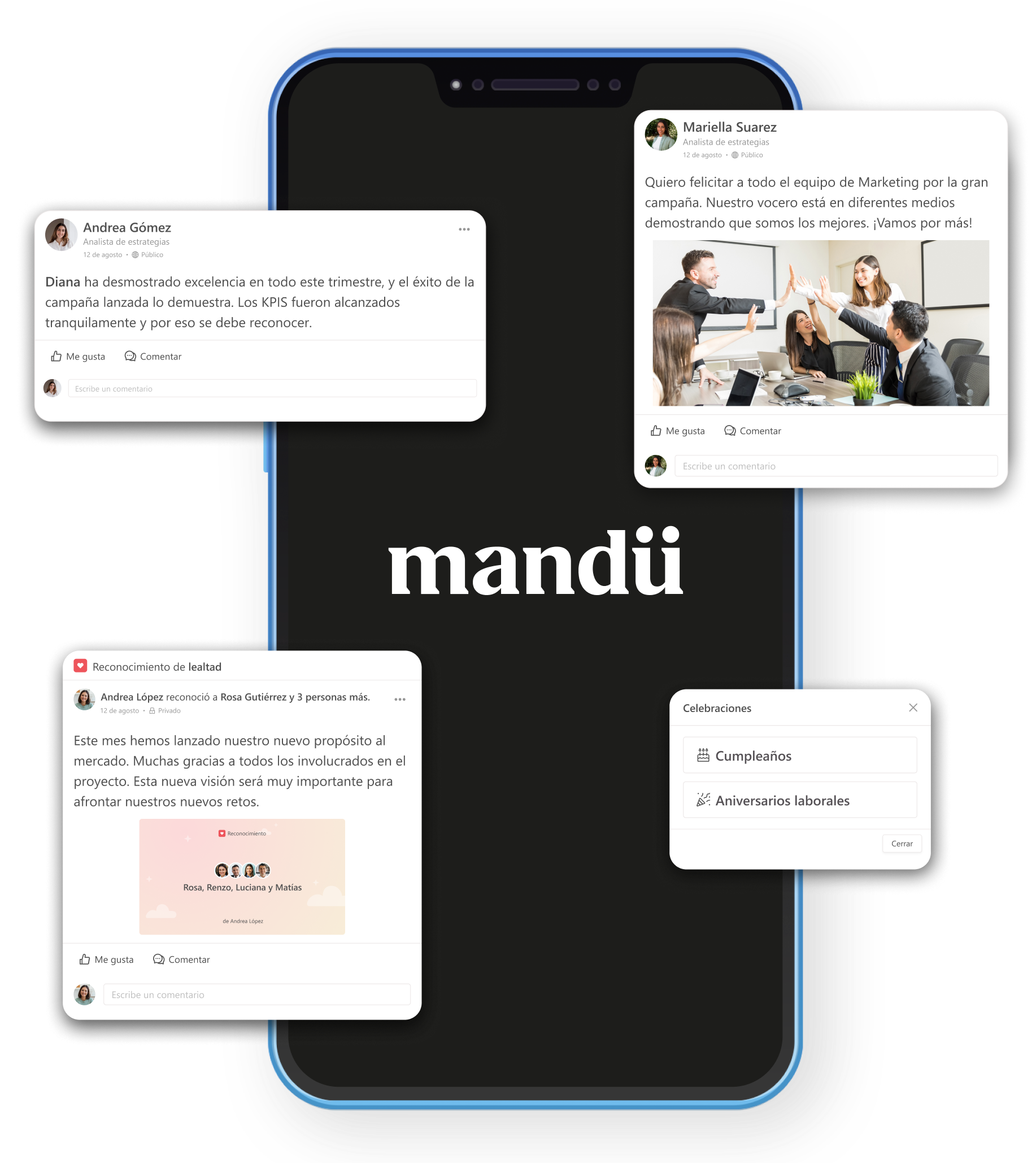 La cultura de una empresa no puede quedarse guardada en un manual o en los muros de la oficina. Debe vivirse y sentirse en cada interacción. La App de recursos humanos de Mandü hace que los valores de tu organización estén presentes en cada reconocimiento, celebración o noticia compartida. Como una red social corporativa pero que respira la personalidad de tu empresa.